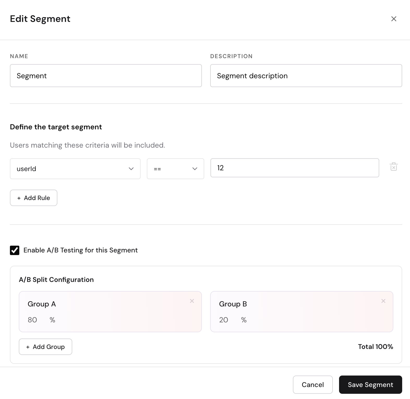 - A/B Testing — Split traffic within a segment to test different variants with percentage-based distribution.